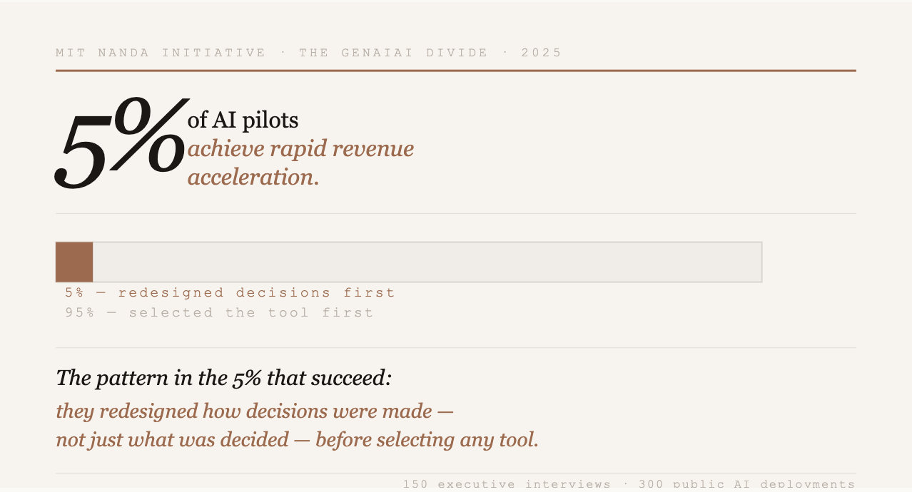 Only 5% of AI pilots achieve rapid revenue acceleration. MIT’s research across 150 executive interviews and 300 public deployments found the clearest pattern among those that succeed: they redesigned how decisions were made - not just what was decided - before selecting any tool.