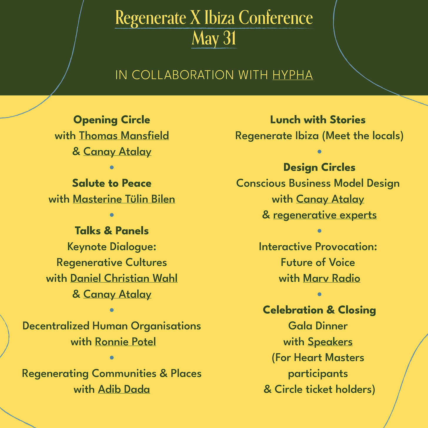 Join the RegenerateX Ibiza Conference Day with a 1-day ticket on Wednesday, May 31 at Tierra Iris and enjoy an inspiring gathering and co-create with Heart Masters participants and guest thought leaders of the regenerative community incl. keynote dialogues and design circles on topics such as Regenerative Cultures, Decentralised Human Organisations, Regenerating Communities & Places, and Conscious Business Model Design.